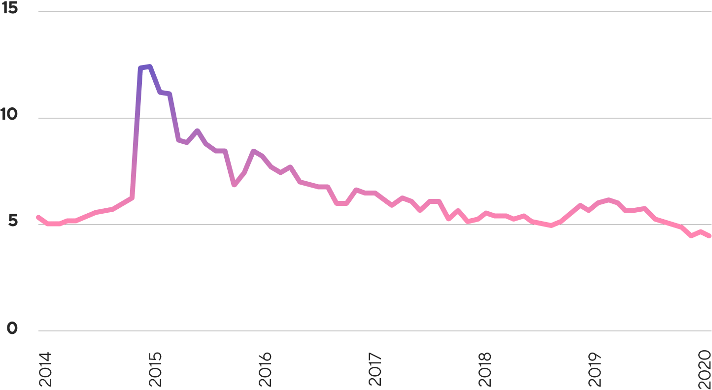Минус депозитов — низкая доходность. Ставки по банковским вкладам находятся на минимальном за последние десять лет уровне. Средняя процентная ставка в январе 2020 года составляла 4,46% годовых, хотя еще в начале 2015 года она была почти 12,3%.