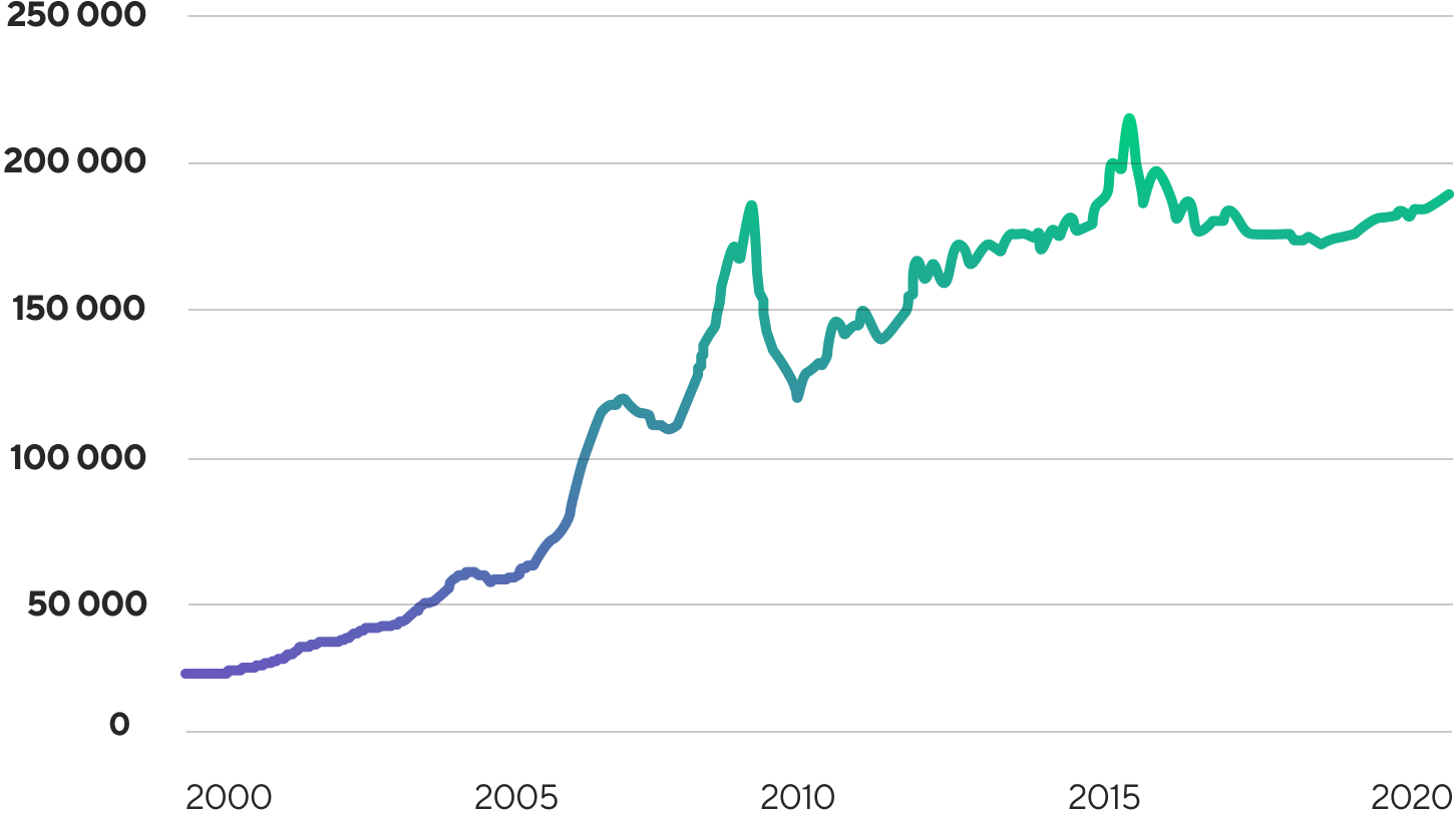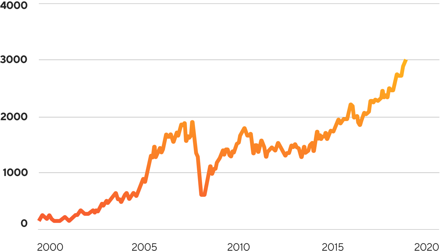 Но не каждый год такой удачный. В кризисный 2008 год индекс упал в два раза. А первую пятилетку десятых годов не показывал быстрого роста.