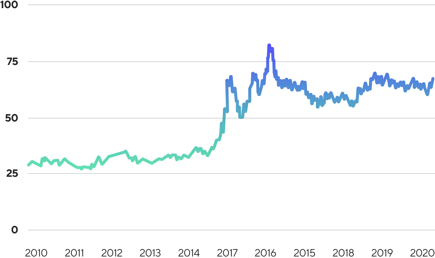 За последние 10 лет доллар вырос более чем в два раза: с 30 рублей за доллар в начале 2010 года до 65–70 рублей в начале 2020 года. Однако рост пришелся на короткий промежуток времени — 2014–2015 годы. Остальные годы курс колеблется не так сильно. С евро ситуация похожая.